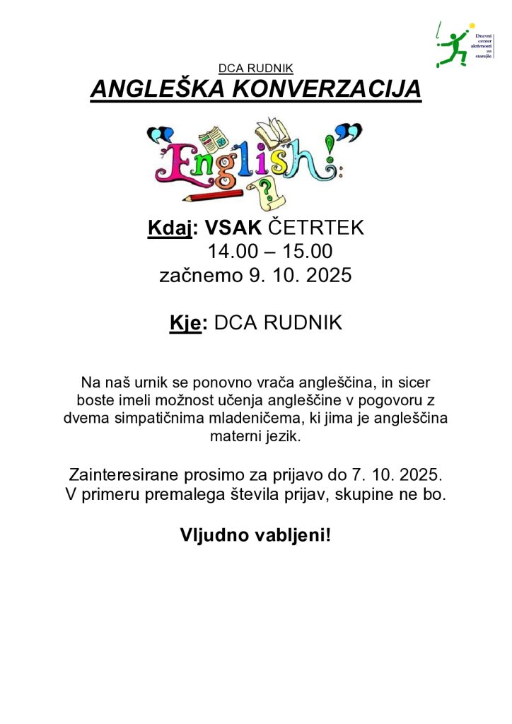Angleška konverzacija Post author:Mateja Kovšca Post published:22. septembra, 2025 Post category:Kaj nas čaka You Might Also Like Sheng Zhen meditacija v DCA Tržaška 1. oktobra, 2025 Tečaj uporabe pametnega telefona, 25. 9. 11. septembra, 2025 Urjenje spomina, 11. 9. 4. septembra, 2025