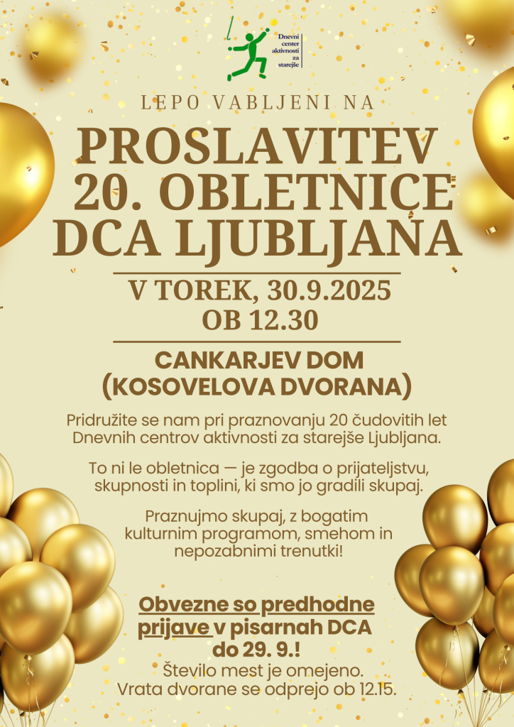 Proslavitev ob 20. obletnici DCA Post author:Anja Novak Post published:24. septembra, 2025 Post category:Kaj nas čaka You Might Also Like Kolesarjenje, 9.10. 30. septembra, 2025 Spontani nastop plesne telovadbe, 1. 10. 26. septembra, 2025 Ruščina, 19. 9. 16. septembra, 2025