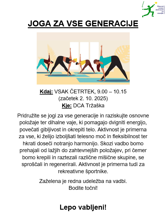 Joga za vse generacije, 2. 10. Post author:golovec Post published:29. septembra, 2025 Post category:Kaj nas čaka You Might Also Like Analiza telesne sestave, 3. 10. 25. septembra, 2025 20. obletnica DCA in Martinovanje, 6. 11. 8. avgusta, 2025 Samomasaža za boljše počutje, 6. 10. 29. septembra, 2025