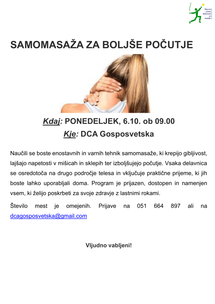Samomasaža za boljše počutje, 6. 10. Post author:golovec Post published:29. septembra, 2025 Post category:Kaj nas čaka You Might Also Like Kolesarski polžki, 15. 9. 11. septembra, 2025 Vadba za koordinacijo, 1. 10. 24. septembra, 2025 Kolesarjenje, 16. 10. 8. oktobra, 2025