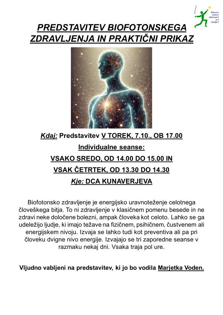 Biofotonsko zdravljenje 7.10. Post author:Andreja Hartner Post published:1. oktobra, 2025 Post category:Kaj nas čaka You Might Also Like Hitri polžki, 10. 10. 6. oktobra, 2025 Utrip jeseni v Murglah, 19. 9. 16. septembra, 2025 Družabne igre, 14. 10. 9. oktobra, 2025