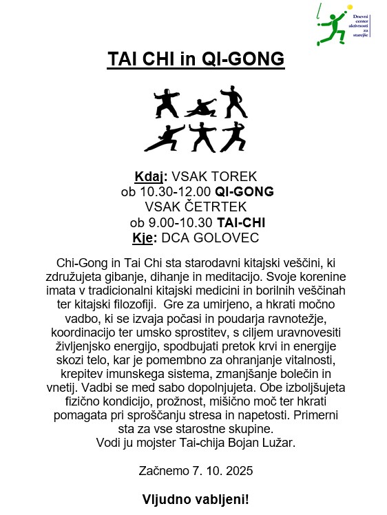 Thai-chi in Qi-gong, 7. 10. Post author:golovec Post published:3. oktobra, 2025 Post category:Kaj nas čaka You Might Also Like Sestanek in druženje članov, 11. 9. 4. septembra, 2025 Pogovori na poti k sebi, 2. 10. 2. oktobra, 2025 20. obletnica DCA in Martinovanje, 6. 11. 8. avgusta, 2025