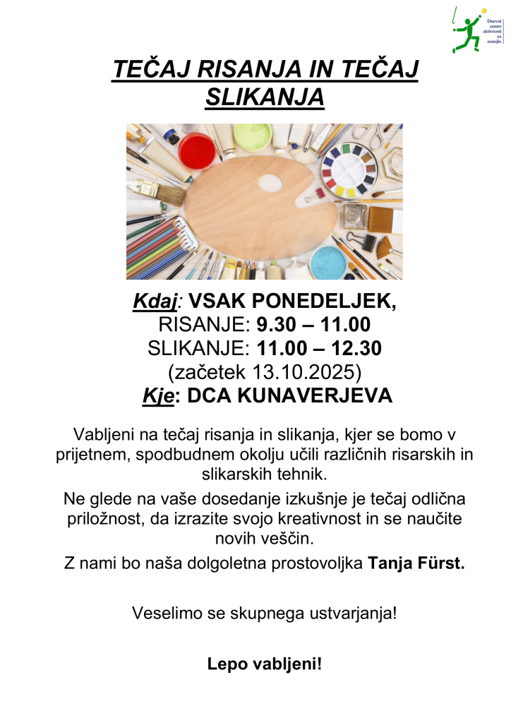 Tečaj risanja in slikanja, 13. 10. Post author:golovec Post published:6. oktobra, 2025 Post category:Kaj nas čaka You Might Also Like Samomasaža za boljše počutje, 6. 10. 29. septembra, 2025 Ruščina, 19. 9. 16. septembra, 2025 Utrip jeseni v Murglah, 19. 9. 16. septembra, 2025
