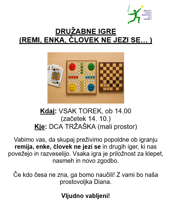 Družabne igre, 14. 10. Post author:golovec Post published:9. oktobra, 2025 Post category:Kaj nas čaka You Might Also Like Festival za 3. življenjsko obdobje 24. septembra, 2025 Proslavitev ob 20. obletnici DCA 24. septembra, 2025 Predavanje: Zakaj z leti večkrat pademo?, 18. 9. 11. septembra, 2025