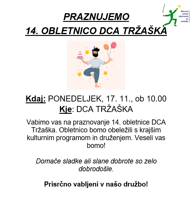 Praznujemo 14. obletnico DCA Tržaška, 17. 11. Post author:golovec Post published:12. novembra, 2025 Post category:Izpostavljeno / Kaj nas čaka You Might Also Like Prednovoletni ples DCA članov, 10. 12. 10. novembra, 2025 Bolečine v križu – praktični nasveti, 21. 11. 17. novembra, 2025 Kolaž spominov na 2023 in uspešen skok v 2024 29. decembra, 2023
