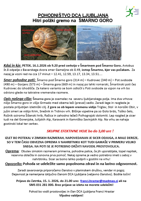 Pohod na Šmarno goro Post author:Anja Novak Post published:12. januarja, 2026 Post category:Kaj nas čaka You Might Also Like Igranje tenisa 7. aprila, 2026 Potopisno predavanje: Romunija, 19.3. 10. marca, 2026 68. pohod Pot ob žici 28. aprila, 2026