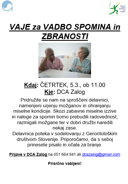 Vaje za vadbo spomina in zbranosti Post author:Anja Novak Post published:23. februarja, 2026 Post category:Kaj nas čaka You Might Also Like Podelitev priznanj prostovoljcem DCA Zalog 12. marca, 2026 Kolesarjenje, 2. 4. 2026 24. marca, 2026 Gokhale metoda 23. februarja, 2026