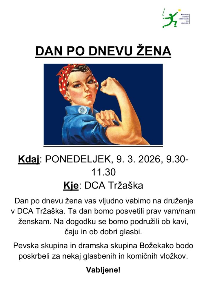 Dan po dnevu žena Post author:Sara Dalila Hočevar Post published:26. februarja, 2026 Post category:Kaj nas čaka Post comments:0 Comments You Might Also Like Praznovanje Dan žena in Gregorjevo 2. marca, 2026 Joga za začetnike, 12. 1. 9. januarja, 2026 Druženje z Ambasadorji nasmeha, 9.2. in 23.2. 2. februarja, 2026 Dodaj odgovor Prekliči odgovorCommentEnter your name or username to comment Enter your email address to comment Enter your website URL (optional) Shrani moje ime, e-pošto in spletišče v ta brskalnik za naslednjič, ko komentiram.