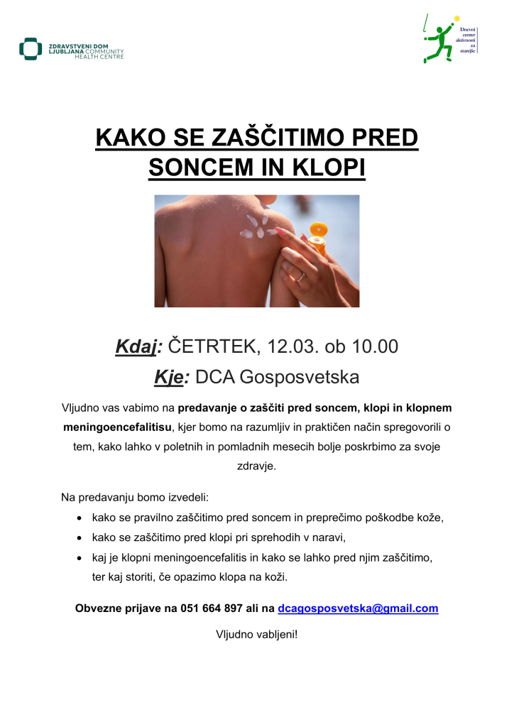 Kako se zaščitimo pred soncem in klopi Post author:Sara Dalila Hočevar Post published:9. marca, 2026 Post category:Kaj nas čaka Post comments:0 Comments You Might Also Like Pohod s Hitrimi polžki – po delu Čemšeniške grajske poti 24. februarja, 2026 Umovadba 30. marca, 2026 Potopisno predavanje: Romunija, 19.3. 10. marca, 2026 Dodaj odgovor Prekliči odgovorCommentEnter your name or username to comment Enter your email address to comment Enter your website URL (optional) Shrani moje ime, e-pošto in spletišče v ta brskalnik za naslednjič, ko komentiram.