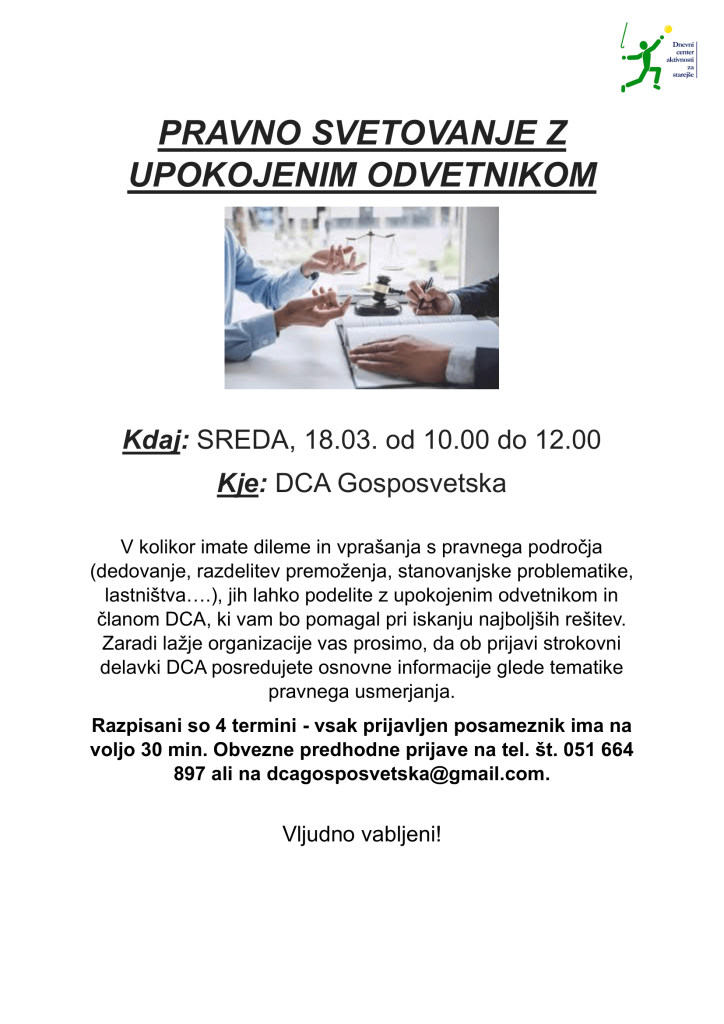 Pravno svetovanje z upokojenim odvetnikom Post author:Sara Dalila Hočevar Post published:11. marca, 2026 Post category:Kaj nas čaka Post comments:0 Comments You Might Also Like Vadba na stolu 23. februarja, 2026 Pohod s Hitrimi polžki – po delu Čemšeniške grajske poti 24. februarja, 2026 Joga za vse generacije, 9. 2. 4. februarja, 2026 Dodaj odgovor Prekliči odgovorCommentEnter your name or username to comment Enter your email address to comment Enter your website URL (optional) Shrani moje ime, e-pošto in spletišče v ta brskalnik za naslednjič, ko komentiram.