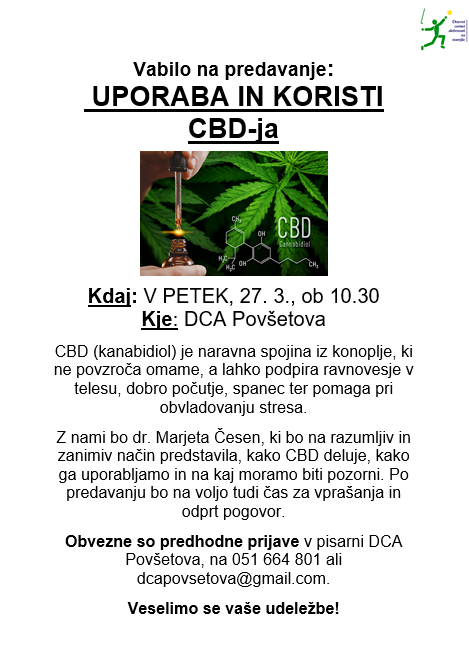 Uporaba in koristi CBD-ja Post author:Sara Dalila Hočevar Post published:19. marca, 2026 Post category:Kaj nas čaka Post comments:0 Comments You Might Also Like Pohod s Hitrimi polžki – po delu Čemšeniške grajske poti 24. februarja, 2026 Nemščina za vsak dan 2. marca, 2026 Sajenje z Mini vrtcem 26. marca, 2026 Dodaj odgovor Prekliči odgovorCommentEnter your name or username to comment Enter your email address to comment Enter your website URL (optional) Shrani moje ime, e-pošto in spletišče v ta brskalnik za naslednjič, ko komentiram.