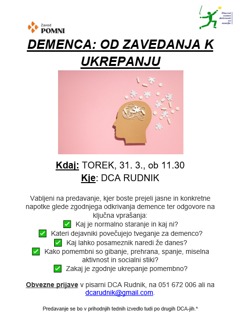 Demenca: Od zavedanja k ukrepanju Post author:Sara Dalila Hočevar Post published:25. marca, 2026 Post category:Kaj nas čaka Post comments:0 Comments You Might Also Like Latino solo ples 23. februarja, 2026 Anton Prosen: Po klancu navzgor, 19. 2. 13. februarja, 2026 Računalništvo individualno 23. februarja, 2026 Dodaj odgovor Prekliči odgovorCommentEnter your name or username to comment Enter your email address to comment Enter your website URL (optional) Shrani moje ime, e-pošto in spletišče v ta brskalnik za naslednjič, ko komentiram.