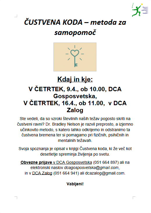 Čustvena koda – metoda za samopomoč Post author:Sara Dalila Hočevar Post published:2. aprila, 2026 Post category:Kaj nas čaka Post comments:0 Comments You Might Also Like Predstavitev del Friderika Franca 29. decembra, 2025 Dobrodelna akcija ob materinskem dnevu, 5.2.-27.2. 2. februarja, 2026 Demenca: Od zavedanja k ukrepanju 25. marca, 2026 Dodaj odgovor Prekliči odgovorCommentEnter your name or username to comment Enter your email address to comment Enter your website URL (optional) Shrani moje ime, e-pošto in spletišče v ta brskalnik za naslednjič, ko komentiram.