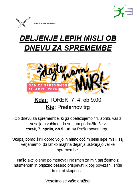 Deljenje misli ob Dnevu za spremembe Post author:Sara Dalila Hočevar Post published:2. aprila, 2026 Post category:Izpostavljeno / Kaj nas čaka Post comments:0 Comments You Might Also Like Pohod po gorenjski veji Jakobove poti 5. marca, 2026 Vadba na Fakulteti za šport 8. januarja, 2026 Izlet DCA 2. aprila, 2026 Dodaj odgovor Prekliči odgovorCommentEnter your name or username to comment Enter your email address to comment Enter your website URL (optional) Shrani moje ime, e-pošto in spletišče v ta brskalnik za naslednjič, ko komentiram.