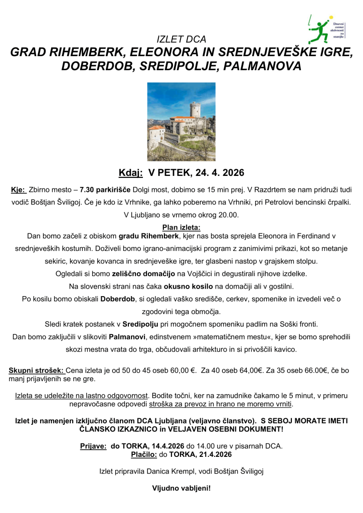 Izlet DCA Post author:Sara Dalila Hočevar Post published:2. aprila, 2026 Post category:Izpostavljeno / Kaj nas čaka Post comments:0 Comments You Might Also Like Kolesarjenje, 2. 4. 2026 24. marca, 2026 Izdelovanje rožic 3. marca, 2026 Pomlad med nami 5. marca, 2026 Dodaj odgovor Prekliči odgovorCommentEnter your name or username to comment Enter your email address to comment Enter your website URL (optional) Shrani moje ime, e-pošto in spletišče v ta brskalnik za naslednjič, ko komentiram.