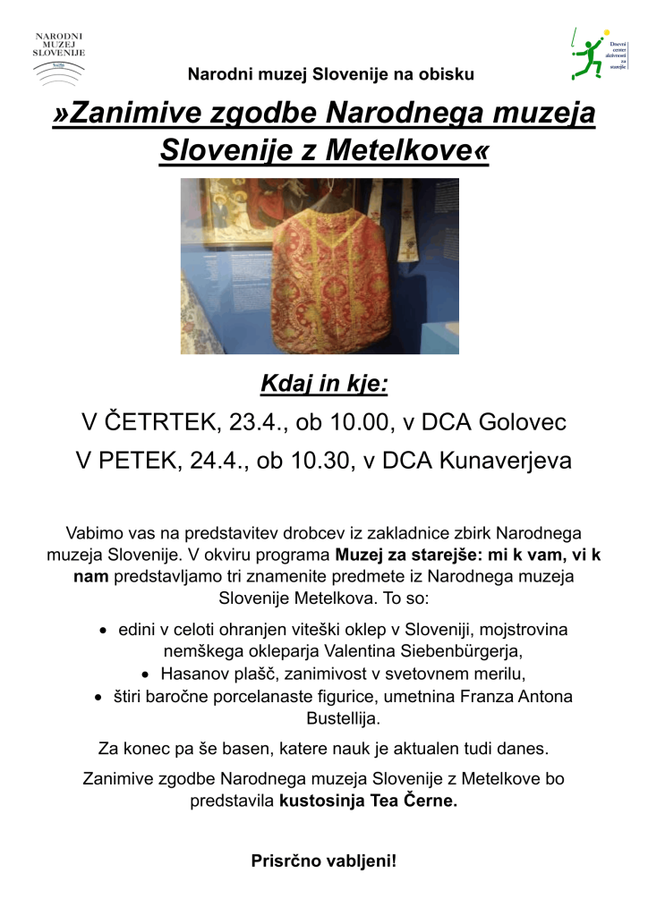 Zanimive zgodbe Narodnega muzeja Slovenije, 23. in 24.4., DCA Golovec in Kunaverjeva Post author:Maša Bastarda Post published:15. aprila, 2026 Post category:Izpostavljeno / Kaj nas čaka Post comments:0 Comments You Might Also Like Druženje z Ambasadorji nasmeha, 23. 2. 16. februarja, 2026 Kolesarjenje: Muzej na meji, 26. 3. 2026 13. marca, 2026 Letovanje DCA v Strunjanu 2. marca, 2026 Dodaj odgovor Prekliči odgovorCommentEnter your name or username to comment Enter your email address to comment Enter your website URL (optional) Shrani moje ime, e-pošto in spletišče v ta brskalnik za naslednjič, ko komentiram.