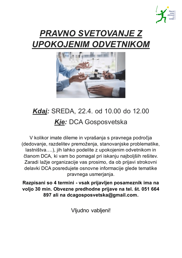 Pravno svetovanje, 22. 4. Post author:Sara Dalila Hočevar Post published:16. aprila, 2026 Post category:Kaj nas čaka Post comments:0 Comments You Might Also Like Kako ohraniti premoženje 11. marca, 2026 Zeliščarstvo DCA Rudnik 17. marca, 2026 Pohod s Hitrimi polžki in Vandrovčki na 6. marca, 2026 Dodaj odgovor Prekliči odgovorCommentEnter your name or username to comment Enter your email address to comment Enter your website URL (optional) Shrani moje ime, e-pošto in spletišče v ta brskalnik za naslednjič, ko komentiram.