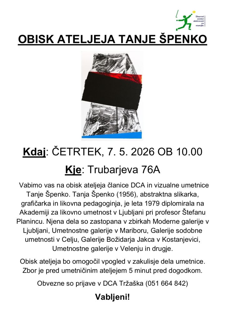 Obisk ateljeja Tanje Špenko Post author:Sara Dalila Hočevar Post published:29. aprila, 2026 Post category:Izpostavljeno / Kaj nas čaka You Might Also Like Voščilo DCA 22. decembra, 2025 Zanimive zgodbe Narodnega muzeja Slovenije z Metelkove 2. marca, 2026 Temeljni postopki oživljanja z uporabo AED 22. decembra, 2025